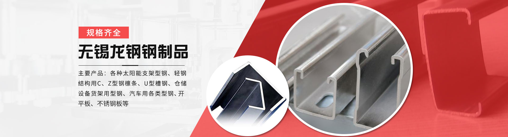 無錫市龍鋼鋼制品有限公司位于風(fēng)景秀麗的太湖之濱---無錫前洲鎮(zhèn),緊依滬寧高速玉祁出口,前洲工業(yè)園,交通十分便利,地理位置優(yōu)越。本公司是生產(chǎn)各種冷彎型鋼的專業(yè)廠家,公司擁有雄厚的技術(shù)力量,優(yōu)越的生產(chǎn)設(shè)備,良好的生產(chǎn)工藝,完善的質(zhì)量保障體系。主要產(chǎn)品:各種太陽(yáng)能支架型鋼、輕鋼結(jié)構(gòu)用C、Z型鋼檁條、U型槽鋼、倉(cāng)儲(chǔ)設(shè)備貨架用型鋼、汽車用各類型鋼、懸掛鏈輸送機(jī)導(dǎo)軌、公路護(hù)攔板及各種非標(biāo)冷彎型鋼和各類高頻焊管。無錫龍鋼愿與您攜手共進(jìn),走向未來、共創(chuàng)輝煌。
